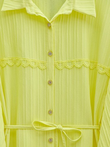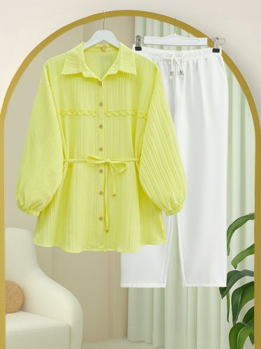 Taşlı Düğmeli Beli Bağlamalı Dantel Detaylı Gömlek -Sarı