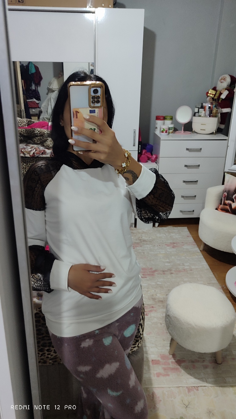 Kadın uzun kollu dantelli kapşonlu viskon iki iplik bluz
