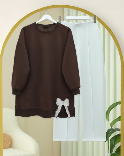 Yuvarlak Yaka Eteği Fiyonk Detaylı Salaş Penye Tunik -Kahve