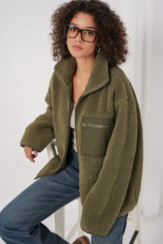 55446 Fermuarlı Oversize Peluş Ceket Mont - Haki