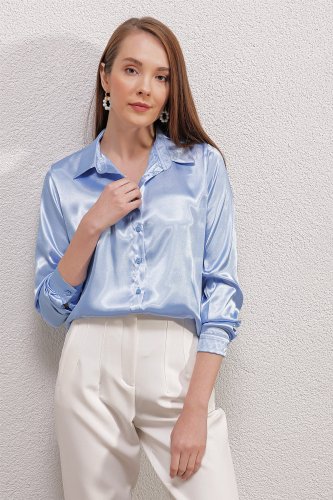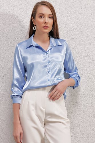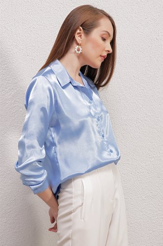 3964 Hafif Dökümlü Saten Gömlek - Mavi