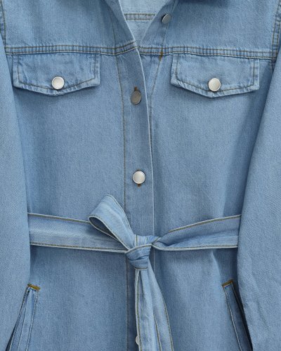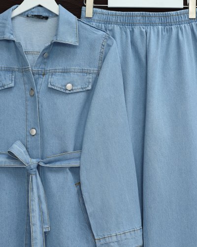 Düğmeli Beli Kemerli Cepli Kot İkili Takım -Açık Mavi