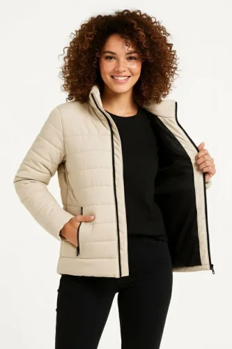 Mikro Su İtici Kapitone Baskılı Astarlı Fermuarlı Bomber Mont - Bej