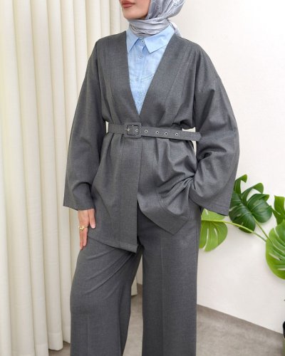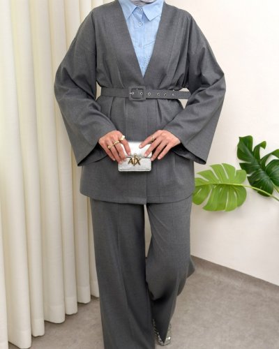 Kemerli Pantolonlu Kimono Takım -Füme