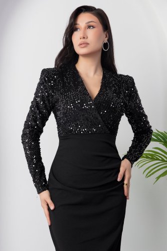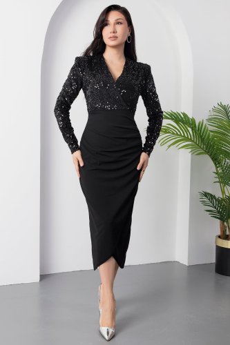 Kadın uzun kollu kruvaze yaka pul payet detay midi boy elbise