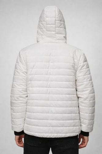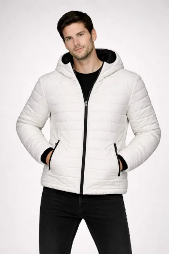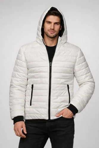 Erkek Şişme Kapüşonlu Fermuarlı Mont Su itici Kapitone Astarlı Kumaş Cepli Kışlık Rahat Kalıp - Krem
