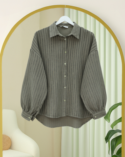 Dikiş Çizgili Arkası Uzun Salaş Müslin Gömlek -Haki