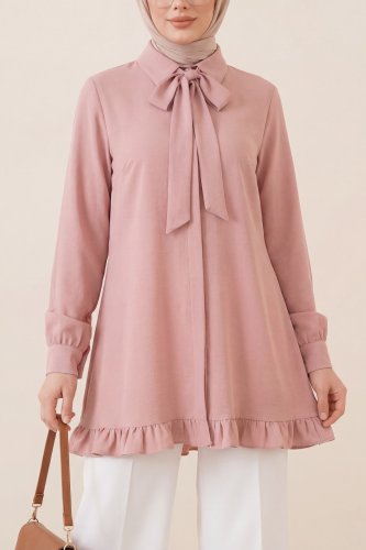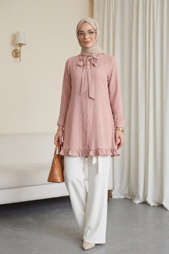 Eteği Fırfırlı Beli Bağcıklı Gizli Düğmeli Modal Tunik -Pudra