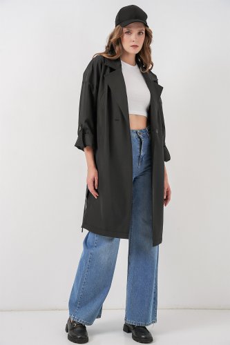 9104 Kruvaze Yaka Astarlı Trençkot - Siyah