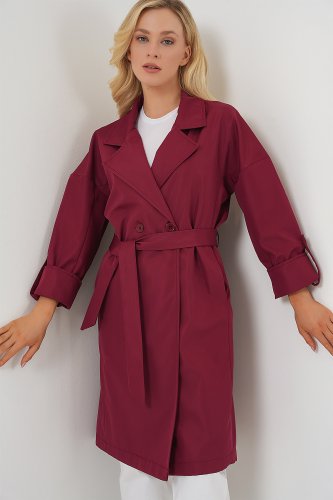 9104 Kruvaze Yaka Astarlı Trençkot - Bordo